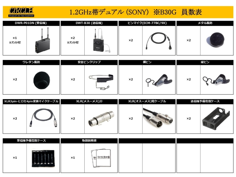 HOME > レンタル機器 > 音声機器(ミキサー/マイク) > ワイヤレスマイク > 1.2GHz帯デュアル (SONY) ※B30/G
